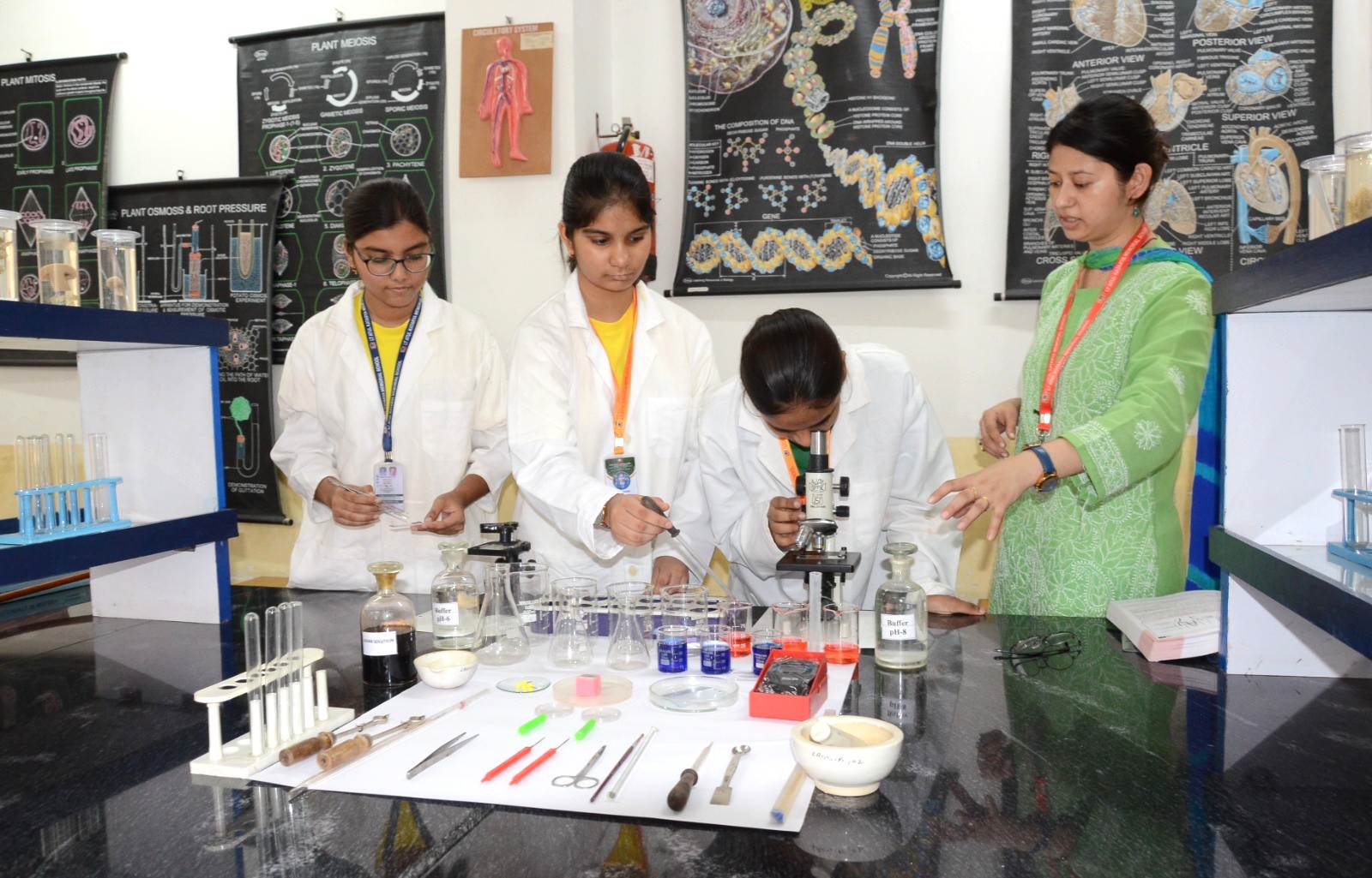 Science is a universal subject that spans the branch of knowledge that examines the structure and behaviour of the physical and natural world through observation and experiment. No course in biology can be considered as complete without including some practical work in it. Biology is a scientific topic, thus it should be learn through experimental method. The laboratory makes teaching of Biology more meaningful and interesting. Biology Laboratory planned to meet the demands of the advacement in science and technology. The marble worktops are heat resistant and storage cabinets are easily accessible. The laboratory apparatus ranges from simple slides, test-tube, Petri dishes to the composite microscopes of varying powers to observe sample and organisms closely. They are high-powered extremely expensive, and sensitive pieces of equipement that can make even the smallest part of a single cell seem clear. Besides the aforesaid the laboratory also has charts, models and specimens meant for demonstrations. The exhaust system efficiently sustains a comfortable environment in the room even while performing experiments requiring chemicals that let out fumes.